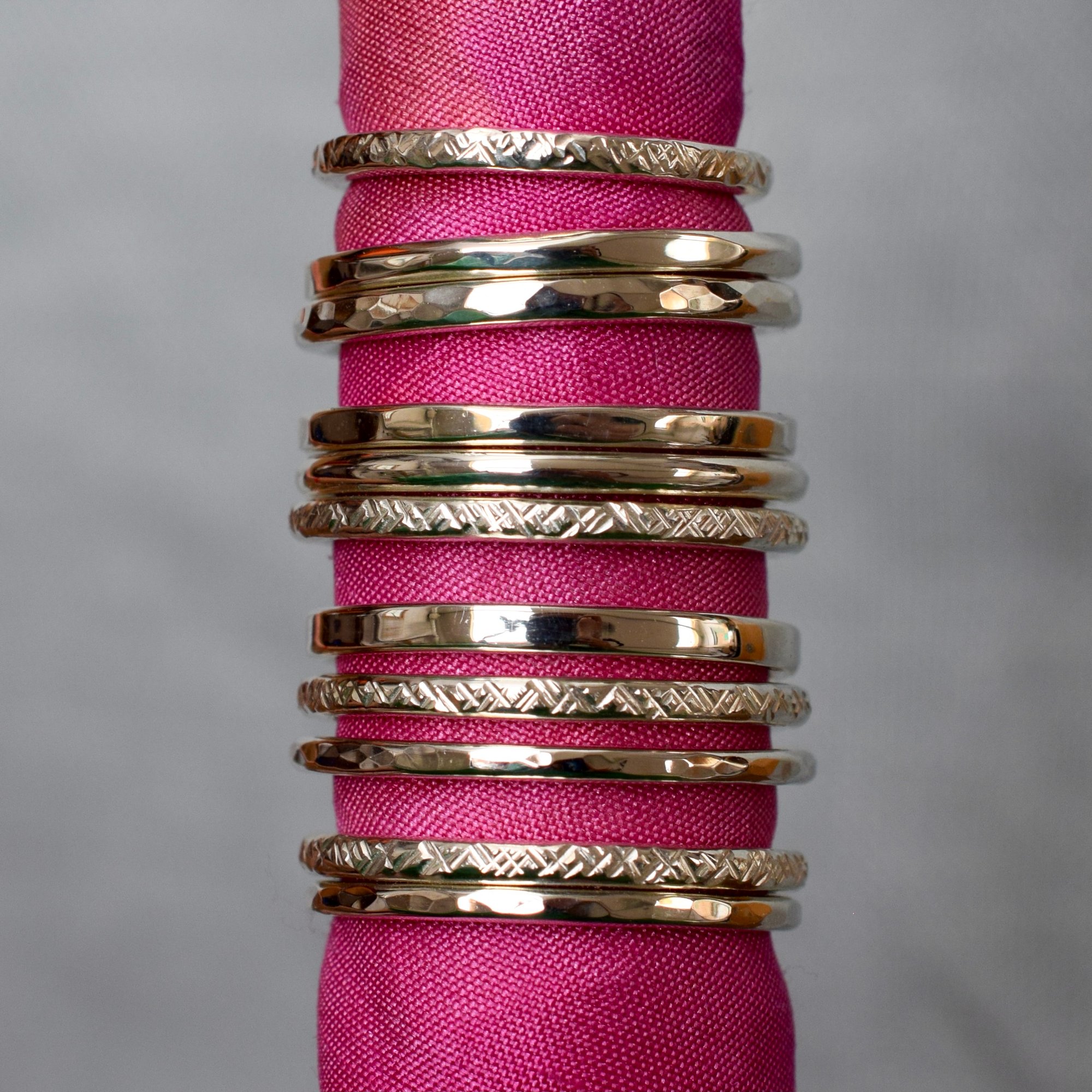 In this three and half hour workshop you will learn traditional silver smithing techniques including forming, soldering, filing and sawing in order to create three individual sterling silver stacker rings.