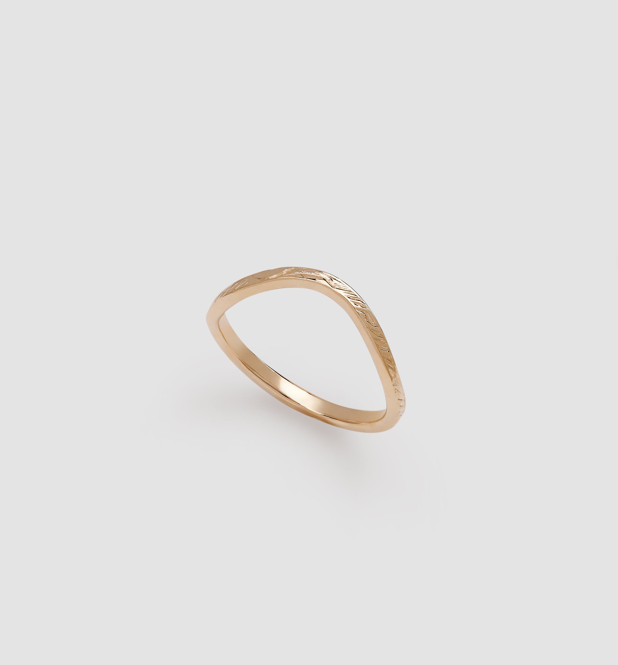 9ct gold curved wedding band with fine plume detail. Handmade using recycled 9ct gold. This ring sits comfortably next to many engagement ring styles.